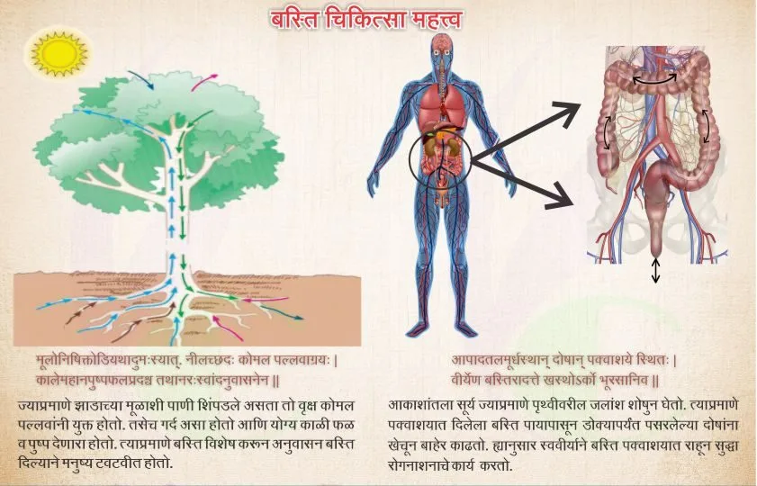 ज्याप्रमाणे झाडाच्या मूळाशी पाणी शिंपडले असता तो वृक्ष कोमल पल्लवांनी युक्त होतो. तसेच गर्द असा होतो आणि योग्य काळी फळ व पुष्प देणारा होतो. त्याप्रमाणे बस्ति विशेष करून अनुवासन बस्ति दिल्याने मनुष्य टवटवीत होतो.